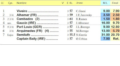 AMBASADOR reapareció luego de su castración, con Carlos Fernández de jinete, el 9 de noviembre en La Zarzuela... Aquella sólo fue una carrera de preparación para ésta temporada de invierno de Dos Hermanas, la que comenzó con una cómoda victoria sobre Lady Otaño y Lunaship en distancia de 1.000 metros... Después le tocó correr con 59 kilos en 1.600 metros finalizando tercero de Cambados en meritoria actuación... AMBASADOR asiste a ésta carrera de Venta como el primer favorito claro en el "Morning Line", con un dividendo probable de 2,60 Euros a ganador y prácticamente todo a favor, ya que baja 200 metros y 3 kilos en la escala... Además ha sido bien llevado por su preparación, una ventaja sobre sus rivales, con agotadoras campañas como dosañeras...