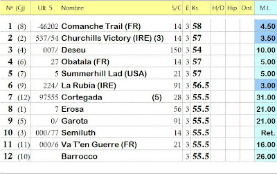Nº: Número. (Cj): Cajón. Ult. 5: Ultimas 5 actuaciones (lectura de izquierda a derecha). Nombre: Nombre del Ejemplar (Origen, si no se coloca es nacido en España). S/C: Días Sin Correr. E: Edad. V: Valor Oficial. H/D: Ganador en el hipódromo y la distancia. Hip.: Ganador en el Hipódromo. Dist.: Ganador en la Distancia. M.L.: "Morning Line"-Cotización Probable Estimada del dividendo a Ganador (se publica el viernes).